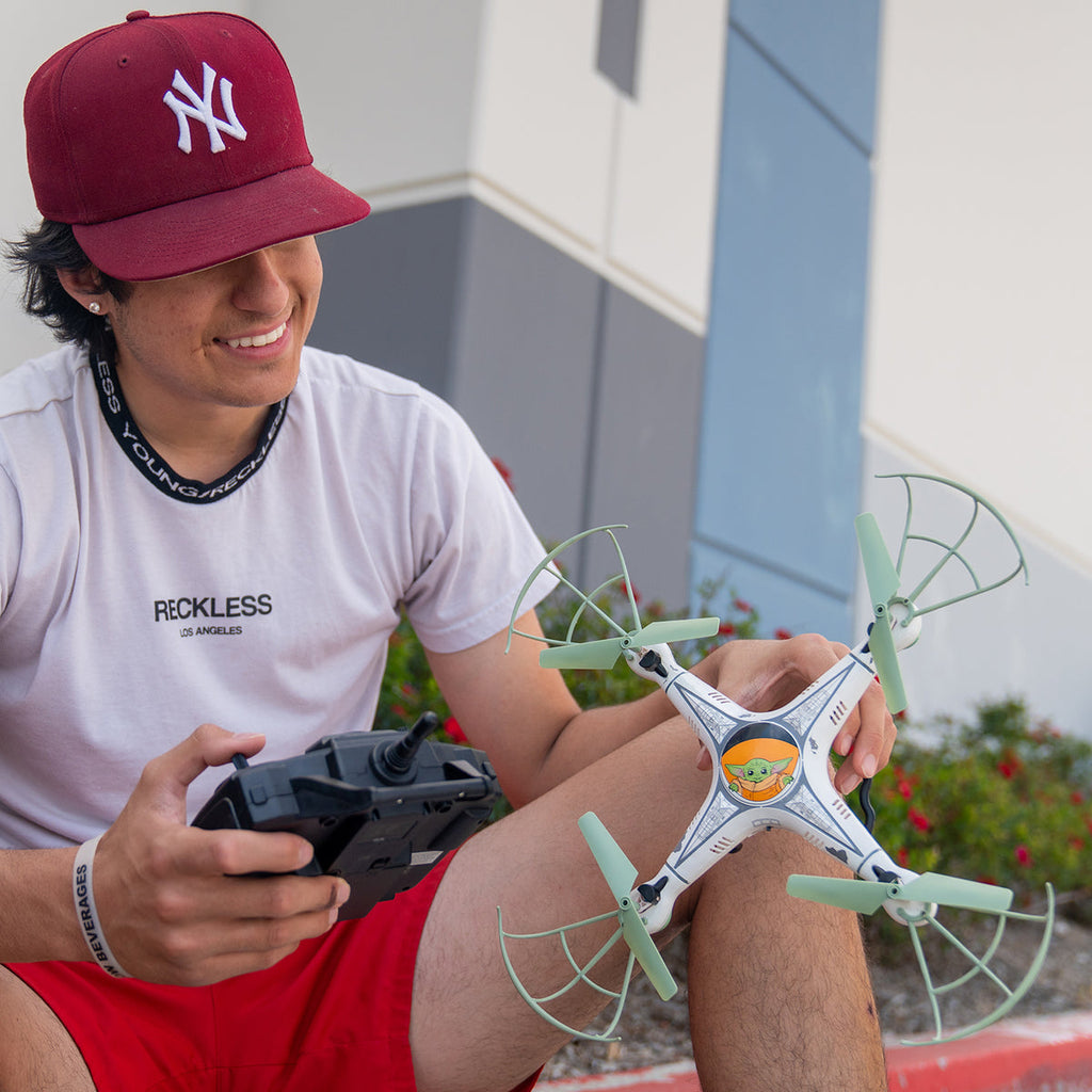 Perform amazing tricks in the sky with the Star Wars The Mandalorian Grogu 2.4GHz 4.5CH RTF RC Drone! This awesome Grogu themed RC drone features a conveniently lightweight body of durable plastic to handle tough conditions. It also has 4.5 channel controls meaning you can fly up/down, forward/backward, strafe left/right and rotate left/right. The internal gyro means you'll always get a smooth flight. It also comes with a 2.4GHz transmitter, so radio interference won't be a problem! Get the Star Wars The Mandalorian Grogu 2.4GHz 4.5CH RTF RC Drone today and fly like no other hero!