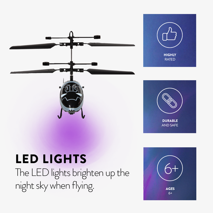 Get ready to have a blast in the sky with the Marvel Licensed Black Panther 2CH Mini IR RTF Electric RC Helicopter! This Black Panther helicopter has a durable lightweight polymer body so you can rest your worries about breaking anything. Controlling this RC helicopter is a breeze and great for people of all skill levels. Featuring a coaxial rotor, a single rear rotor for precise turning, and an IR motion sensitive technology that detect nearby objects and is programmed to move away from them. On the transmitter you press the motion sensor launch button to get started, hold your hand underneath the helicopter to keep it hovering up in the air and when you're done you can turn it off by pressing the motion sensor land button. The LED lights brighten up the night sky when flying. No assembly required! A must have for RC fans, get the Marvel Licensed Black Panther 2CH Mini IR RTF Electric RC Helicopter today!