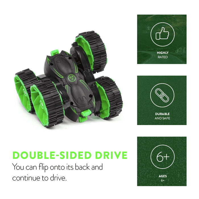 The Phantom Runner is a double-sided driving car that can flip onto its back and continue to drive. Comes with LED lights that brighten the room while performing stunts and with full function controls, it makes this RC stunt car one of the best. All you need is 4 AAA batteries (for the vehicle) and 2 AAA batteries (for the remote) and you're ready to go! Get this awesome World Tech Toys Phantom Runner RTR Electric RC Stunt Car today and have a blast.