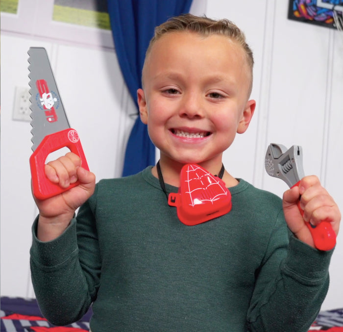 Your kid will love learning carpentry alongside one of their favorite Marvel superheroes with the Spider-Man 14 Piece Carpenter Playset. This 14-piece set will have everything needed to make any kid look like a real carpenter. Comes with a convenient tool belt and pouch to carry tools just like an adult. Including fun Spider-man themed tools like a hammer, screwdriver, plastic hand saw, nuts, bolts and more! Your child will have hours of fun using their imagination with the Spider-Man 14 Piece Carpenter Playset.