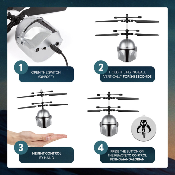 Watch as it flies over your hand for hand-eye coordination and motor skills!Mando Helmet is easy to fly and has no complicated controls, is made of lightweight metal is durable and safe and automatically avoids walls, pets and other objects with advanced Infrared Autopilot.