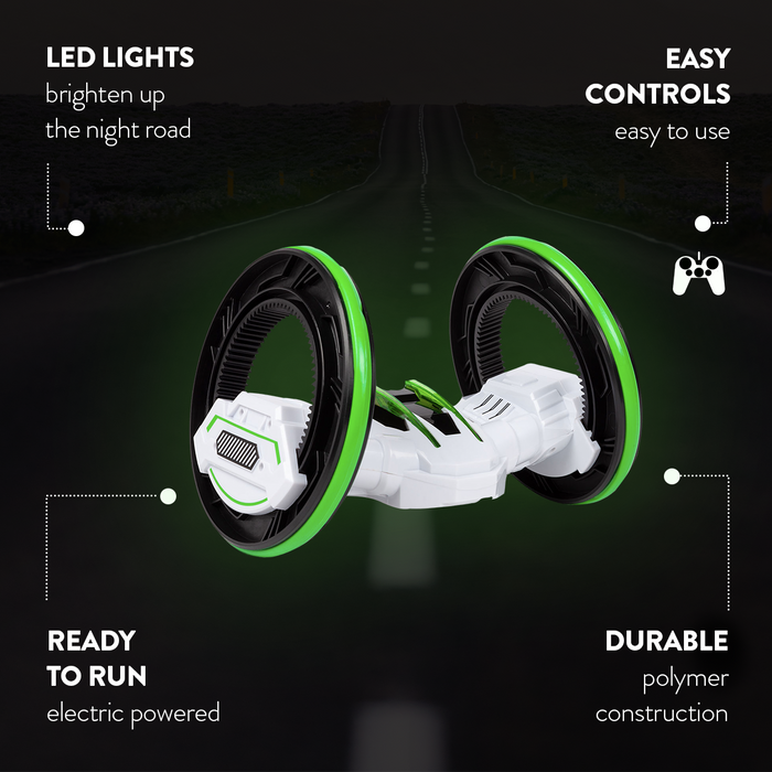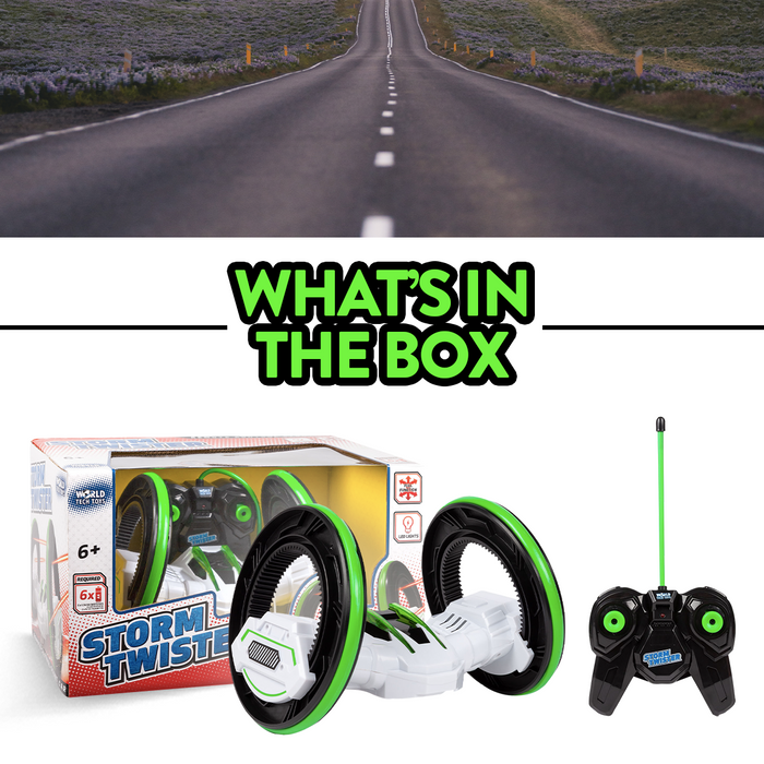 This stunt car features 2 large wheels that will keep it upright at all times on the road or in your living room. The Storm Twister is a stunt car that can perform twists, quick rolls and continue to drive smoothly. The LED lights brighten the room while performing stunts and with full function controls, it makes this RC stunt car one of the best. All you need is 4 AA batteries (for the vehicle) and 2 AA batteries (for the remote) and you're ready to go! Get this awesome World Tech Toys Storm Twister RTR Electric RC Stunt Car and have a blast today.