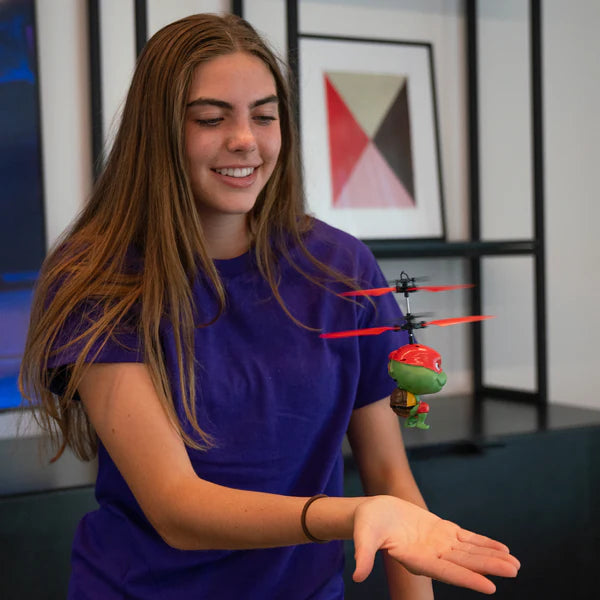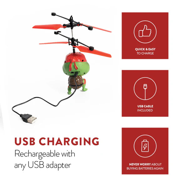 Help protect New York City with the Teenage Mutant Ninja Turtles Mutant MayhemRaphaelIR UFO Big Head Helicopter! This helicopter, made in the likeness ofRaphael from TMNT, features a coaxial rotor system for precise movement and increased stability when hovering. The UFO Big Head Helicopter’s body is constructed of durable materials, making it strong yet lightweight. Simply turn it on and launch it to get started. Holding your hand underneath it will keep it hovering up in the air. When you’re done flying you can just grab it out of the air or use the included remote to shut it down and recover it safely. It's that easy! A must have for fans of the Ninja Turtles or Helicopters, get the Nickelodeon Licensed TMNTRaphael 3.5 Inch Flying Figure IR UFO Big Head Helicopter today!