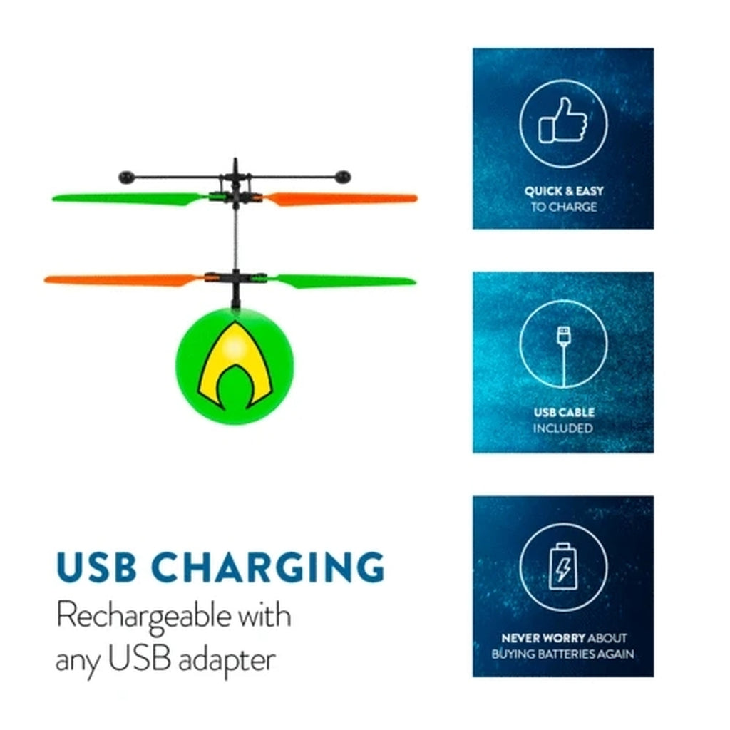Introducing the DC Licensed Aquaman IR UFO Heli Ball! Featuring a coaxial rotor system for precise movement and increased stability when hovering. The UFO Ball Helicopters body is also constructed with a durable material making it strong yet lightweight so you don't have to worry about breaking anything when it lands a bit too rough. Simply turn on and launch to get started, holding your hand underneath it will keep it hovering up in the air. When done flying you can try and grab it but you can also use any IR remote control to shut down and recover safely, it's that easy! A must have for fans of helicopters, get the DC Licensed Aquaman IR UFO Heli Ball today!
