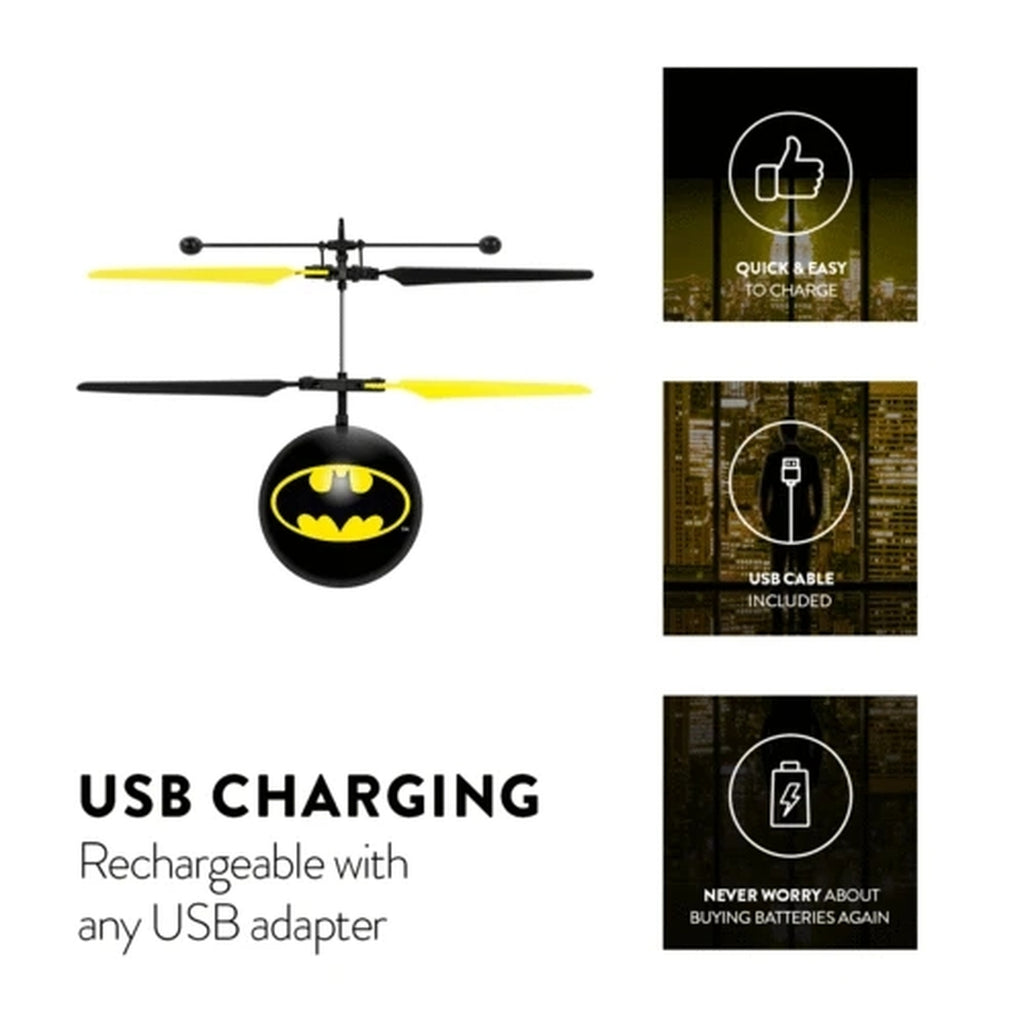 Introducing the DC Licensed Batman IR UFO Heli Ball! Featuring a coaxial rotor system for precise movement and increased stability when hovering. The UFO Ball Helicopters body is also constructed with a durable material making it strong yet lightweight so you don't have to worry about breaking anything when it lands a bit too rough. Simply turn on and launch to get started, holding your hand underneath it will keep it hovering up in the air. When done flying you can try and grab it but you can also use any IR remote control to shut down and recover safely, it's that easy! A must have for fans of helicopters, get the DC Licensed Batman IR UFO Heli Ball today!