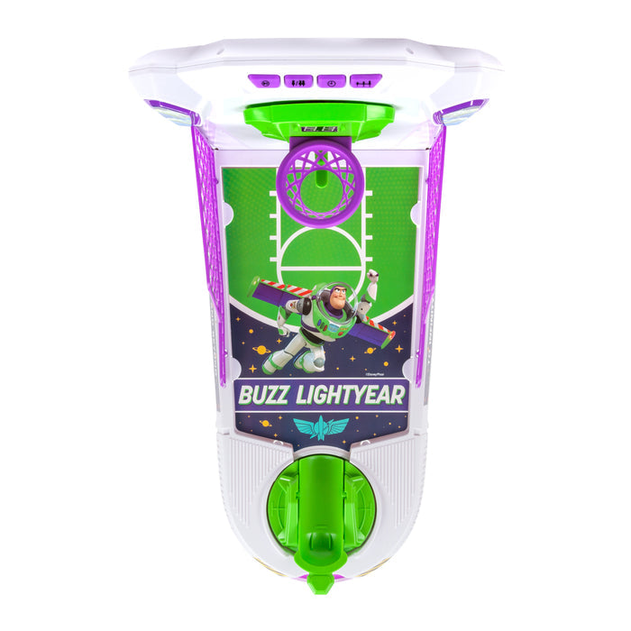 Shoot hoops with your favorite Toy Story character with the Buzz Lightyear Electronic Tabletop Basketball Playset. This mini arcade-style basketball playset features a fun and challenging electronic hoop that moves side to side with 3 levels of difficulty. Keep track of the score with the electronic scoreboard with LED lights and realistic sound effects. Bring a friend and play up to two players with the included toy basketballs. Enjoy playing to infinity and beyond with the Disney Pixar Buzz Lightyear Electronic Tabletop Basketball Playset.