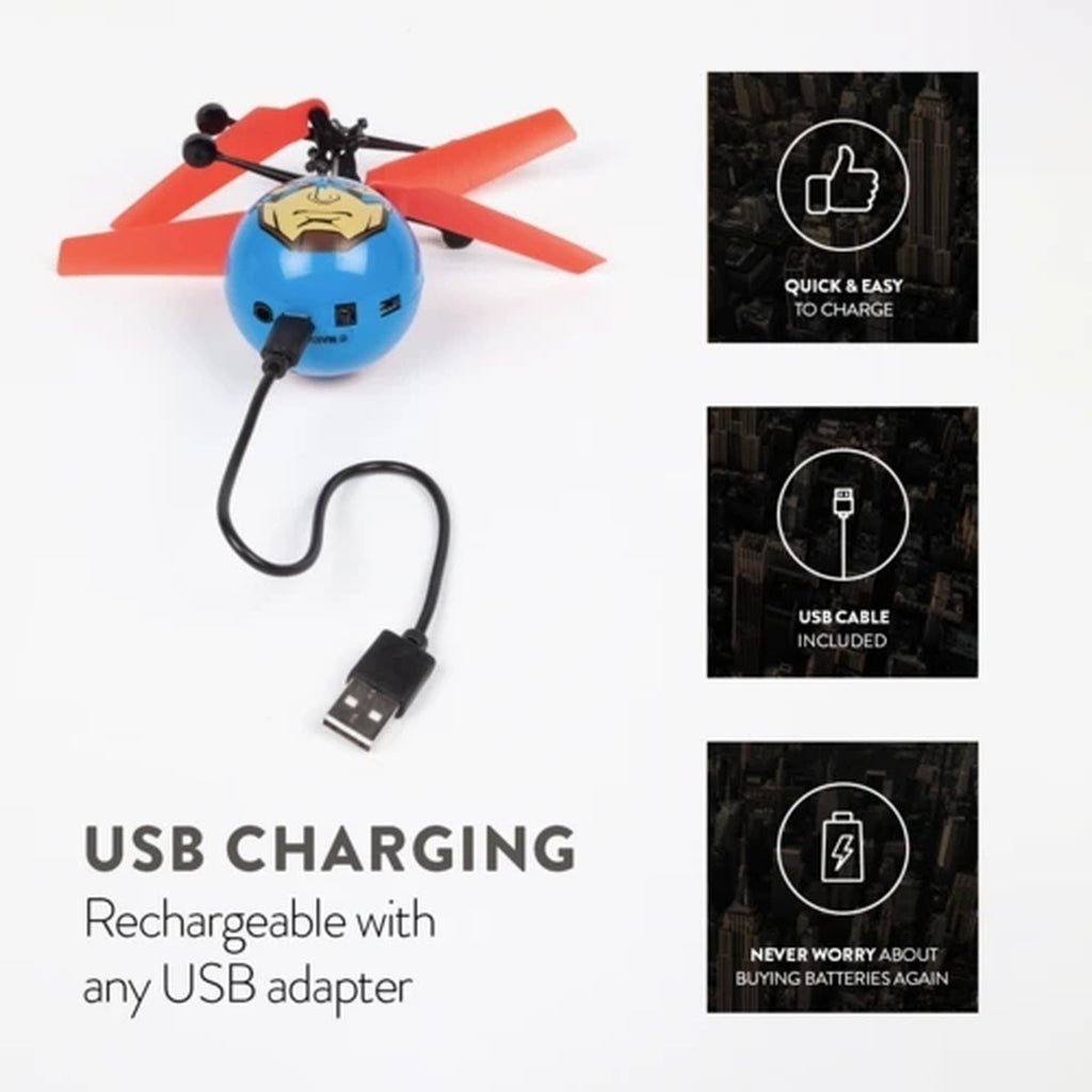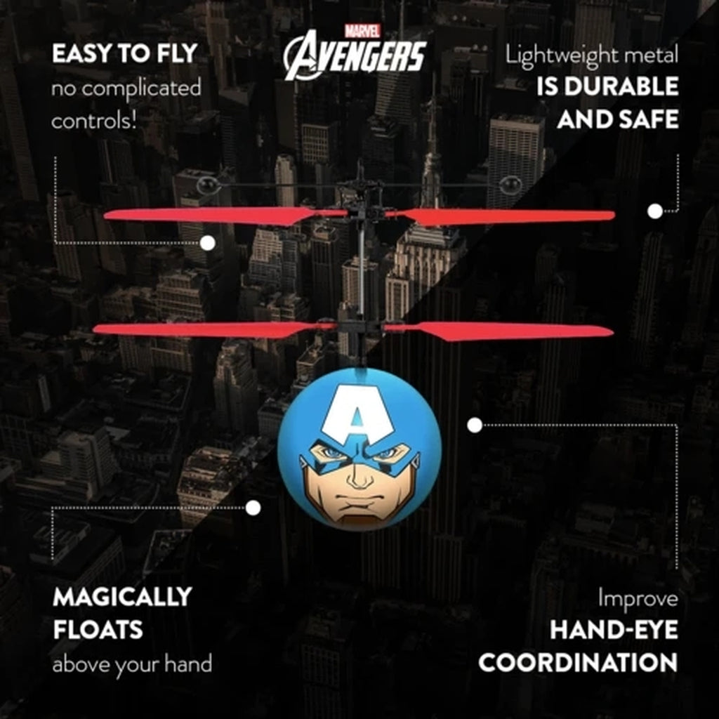 Introducing the Marvel Licensed Avengers Captain America IR UFO Heli Ball! Featuring a coaxial rotor system for precise movement and increased stability when hovering. The UFO Heli Ball's body is also constructed with a durable material making it strong yet lightweight so you don't have to worry about breaking anything when it lands a bit too rough. Simply turn on and launch to get started, holding your hand underneath it will keep it hovering up in the air. When done flying you can try and grab it but you can also use any IR remote control to shut down and recover safely, it's that easy! A must have for fans of helicopters, get the Marvel Avengers Captain America IR UFO Heli Ball today!