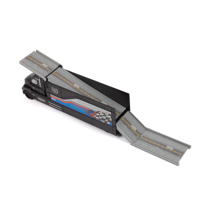 Catapult your race car into action with this World Tech Toys Diecast Cruisers 13-Piece Catapult Truck Playset. With the built-in launch button, send out your fastest cars from the catapult truck into the race! This playset comes complete with a catapult truck, 4 race cars, street accessories, and lots of stickers to personalize your launch truck. Get ready for the race of a lifetime with the World Tech Toys Diecast Cruisers 13-Piece Catapult Truck Playset!
