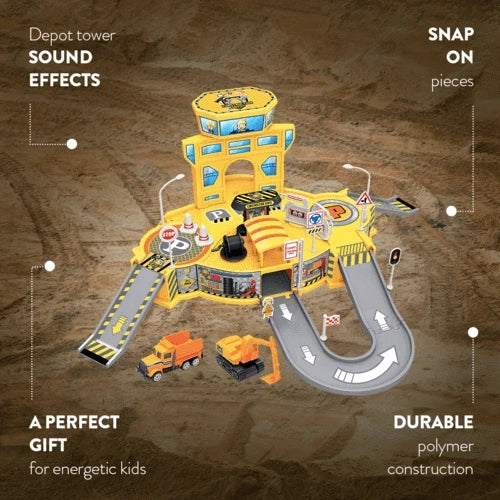 Get your constructions projects started with this World Tech Toys Diecast Cruisers 31-Piece Construction Depot Playset. This amazing construction zone track is a complex depot for all construction workers. You get 31 pieces including 2 construction vehicles, track pieces, street signs and over 40 stickers. Snap the tracks together to get this construction depot up and running, just pop in 2 AAA batteries for the Depot Tower and you're ready to start playing. Hurry and get the World Tech Toys Diecast Cruisers 31-Piece Construction Depot Playset today!