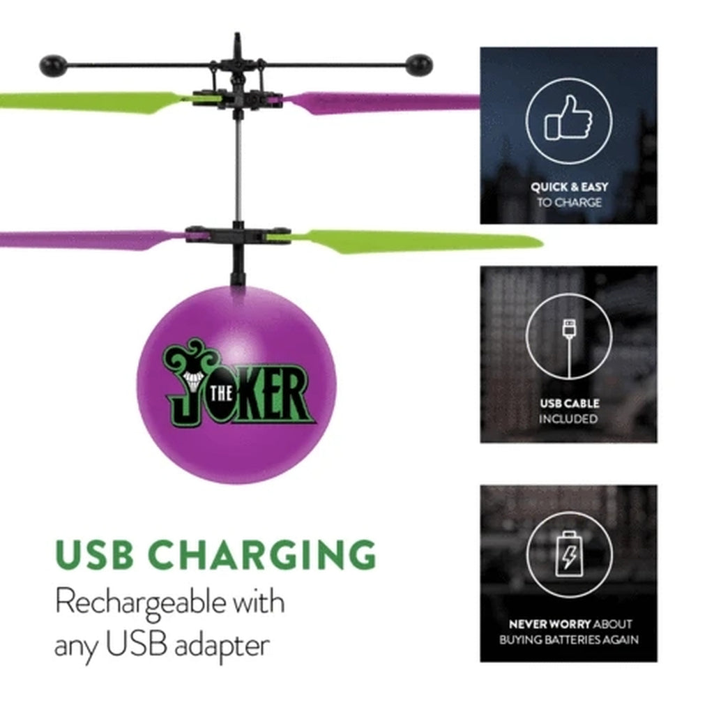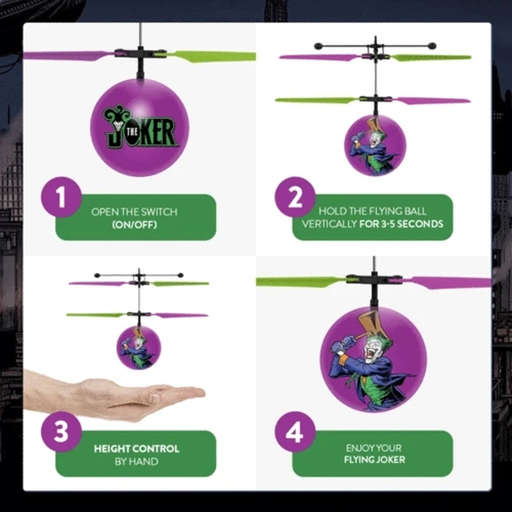 Introducing the DC Licensed The Joker IR UFO Heli Ball! Featuring a coaxial rotor system for precise movement and increased stability when hovering. The UFO Ball Helicopters body is also constructed with a durable material making it strong yet lightweight so you don't have to worry about breaking anything when it lands a bit too rough. Simply turn on and launch to get started, holding your hand underneath it will keep it hovering up in the air. When done flying you can try and grab it but you can also use any IR remote control to shut down and recover safely, it's that easy! A must have for fans of helicopters, get the DC Licensed The Joker IR UFO Heli Ball today!