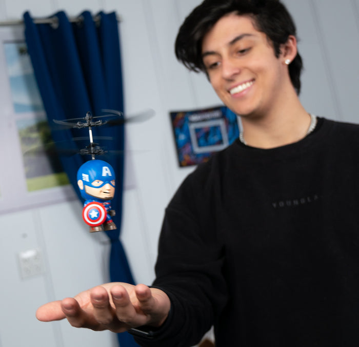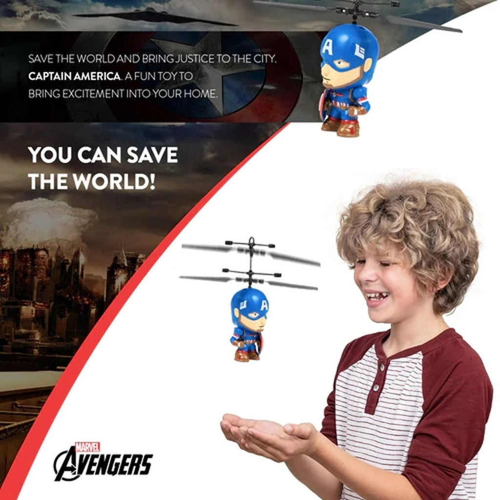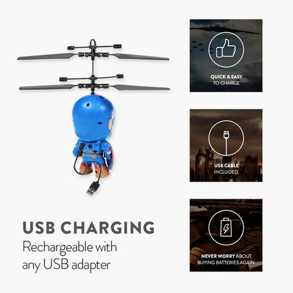 Introducing the Marvel Licensed Captain America 3.5 Inch Flying Figure IR UFO Big Head Helicopter! Stand for justice with this Captain America big head helicopter featuring a coaxial rotor system for precise movement and increased stability when hovering. The UFO Big Head Helicopters body is also constructed with a durable material making it strong yet lightweight so you don't have to worry about breaking anything when it lands a bit too rough. Simply turn on and launch to get started, holding your hand underneath it will keep it hovering up in the air. When done flying you can try and grab it but you can also use the included remote control to shut down and recover safely, it's that easy! A must have for fans of helicopters, get the Marvel Licensed Captain America 3.5 Inch Flying Figure IR UFO Big Head Helicopter today!