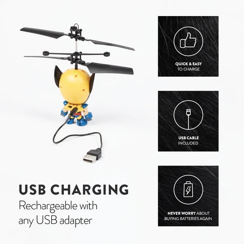 Introducing the Marvel Licensed X-Men Wolverine 3.5 Inch Flying Figure IR UFO Big Head Helicopter! Save the world with this Wolverine big head helicopter featuring a coaxial rotor system for precise movement and increased stability when hovering. The UFO Big Head Helicopters body is also constructed with a durable material making it strong yet lightweight so you don't have to worry about breaking anything when it lands a bit too rough. Simply turn on and launch to get started, holding your hand underneath it will keep it hovering up in the air. When done flying you can try and grab it but you can also use the included remote control to shut down and recover safely, it's that easy! A must have for fans of helicopters, get the Marvel Licensed X-Men Wolverine 3.5 Inch Flying Figure IR UFO Big Head Helicopter today!