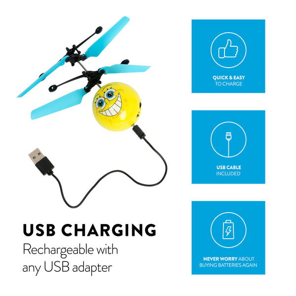 Introducing the Nickelodeon Licensed SpongeBob IR UFO Heli Ball! Featuring a coaxial rotor system for precise movement and increased stability when hovering. The UFO Heli Ball's body is constructed with durable material, making it strong yet lightweight, so you don't have to worry about breaking anything when it lands a bit too rough. Simply turn on and launch to get started; holding your hand underneath it will keep it hovering up in the air. When you're done flying, you can try and grab it, but you can also use any IR remote control to shut down and recover safely—it's that easy! A must-have for fans of helicopters, get the Nickelodeon SpongeBob IR UFO Heli Ball today!