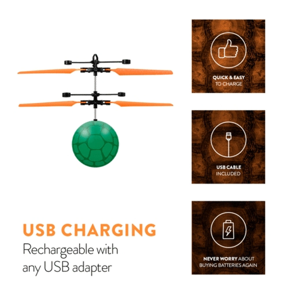 Introducing the Nickelodeon Teenage Mutant Ninja Turtles Michelangelo IR UFO Motion Sensing Helicopter! Featuring a coaxial rotor system for precise movement and increased stability when hovering. The UFO Ball Helicopters body is also constructed with a durable material making it strong yet lightweight so you don't have to worry about breaking anything when it lands a bit too rough. Using infrared motion sensitive technology, the UFO ball will detect nearby objects and is programmed to move away from them. Simply turn on and launch to get started, holding your hand underneath it will keep it hovering up in the air. When done flying you can try and grab it but you can also use any IR remote control to shut down and recover safely, it's that easy! A must have for fans of helicopters, get the Nickelodeon Teenage Mutant Ninja Turtles Michelangelo IR UFO Motion Sensing Helicopter today!