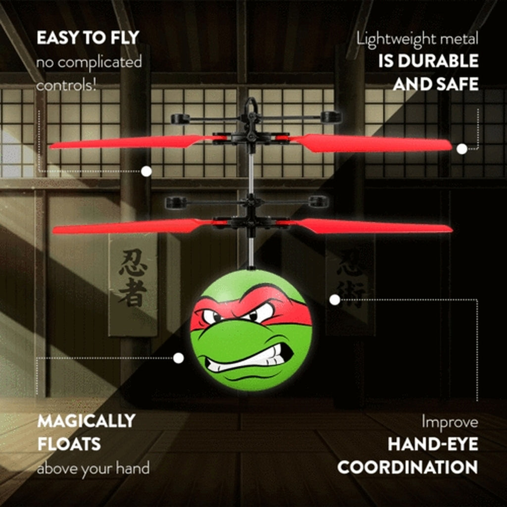 Introducing the Nickelodeon Teenage Mutant Ninja Turtles Raphael IR UFO Motion Sensing Helicopter! Featuring a coaxial rotor system for precise movement and increased stability when hovering. The UFO Ball Helicopters body is also constructed with a durable material making it strong yet lightweight so you don't have to worry about breaking anything when it lands a bit too rough. Using infrared motion sensitive technology, the UFO ball will detect nearby objects and is programmed to move away from them. Simply turn on and launch to get started, holding your hand underneath it will keep it hovering up in the air. When done flying you can try and grab it but you can also use any IR remote control to shut down and recover safely, it's that easy! A must have for fans of helicopters, get the Nickelodeon Teenage Mutant Ninja Turtles Raphael IR UFO Motion Sensing Helicopter today!