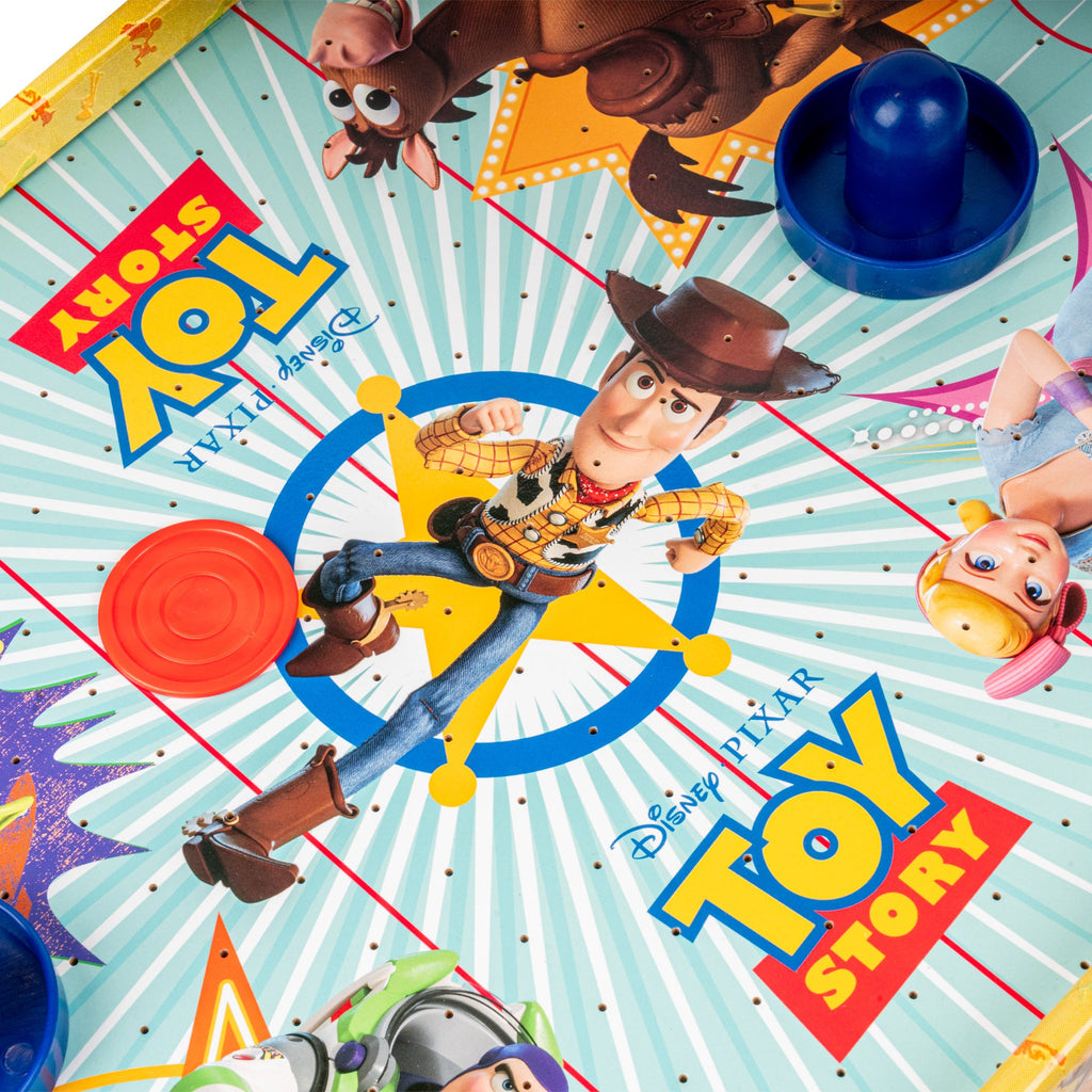 Unleash the fun with this officially licensed Toy Story Electronic Tabletop Air Hockey Table! Join Woody, Buzz Lightyear, and the gang for fast-paced arcade action featuring vibrant, full-color Toy Story graphics. The smooth wooden playing surface and easy manual score trackers make every match exciting and competitive. Whether it’s family game night or playtime with friends, this Toy Story air hockey table delivers hours of laughter and adventure. Built to last and simple to set up — it’s the perfect addition to any little Space Ranger’s playroom!